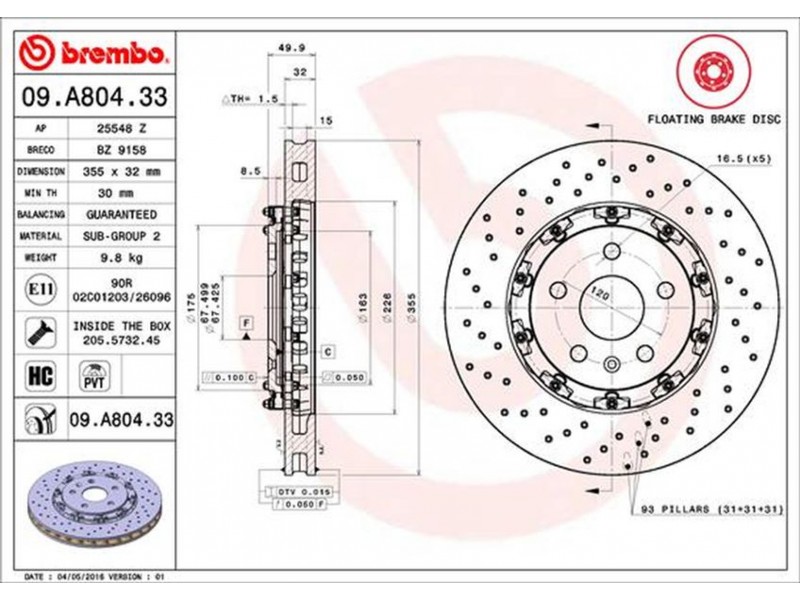 09.A804.33 - ΔΙΣΚ.ΕΜ. ΤΡ. ΠΛΕΥΣΤΟΙ OPEL OPC (355X32) BREMBO 09.A804.33 - Δισκόπλακα