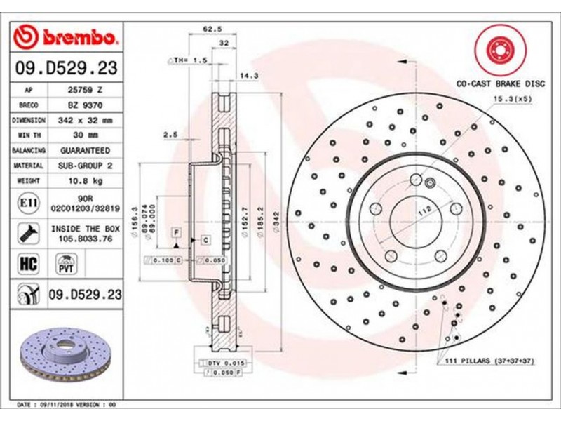 09.D529.23 ΔΙΣΚ.ΤΡΥΠΗΤΟΙ ΕΜΠΡ.MB W205 (SPORT SYST) (342X32) BREMBO 09.D529.23 - Δισκόπλακα