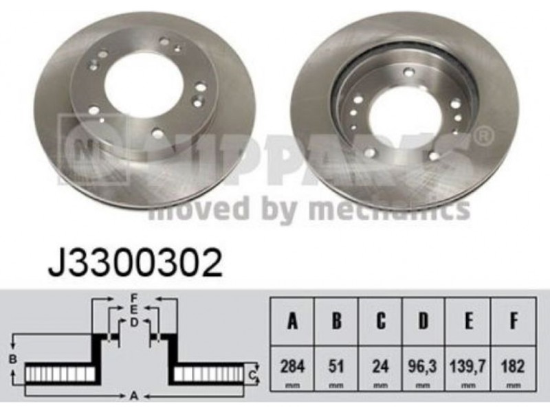 Criteries : Αριθμός οπών 5, Διάμετρος κέντρωσης [mm] 96,3, Διάμετρος κύκλου οπής [mm] 139,7, Διάμετρος πλήμνης τροχού [mm] 182, Ελάχιστο πάχος [mm] 22,4, Εξωτερική διάμετρος [mm] 284, Πάχος δισκόπλακας [mm] 24, Πλευρά τοποθέτησης μπροστινός άξονας, Τύπος δισκόφρενων εσωτερικά αεριζόμενο, Υψος [mm] 51