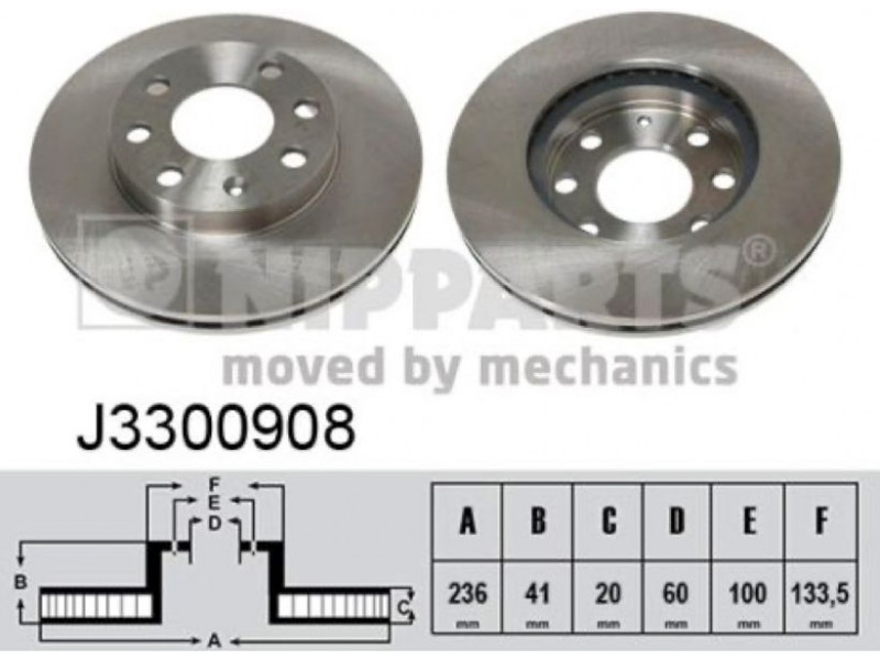 Criteries : Αριθμός οπών 4, Διάμετρος κέντρωσης [mm] 60, Διάμετρος κύκλου οπής [mm] 100, Διάμετρος πλήμνης τροχού [mm] 133,5, Ελάχιστο πάχος [mm] 17, Εξωτερική διάμετρος [mm] 236, Πάχος δισκόπλακας [mm] 20, Πλευρά τοποθέτησης μπροστινός άξονας, Τύπος δισκόφρενων εσωτερικά αεριζόμενο, Υψος [mm] 41
