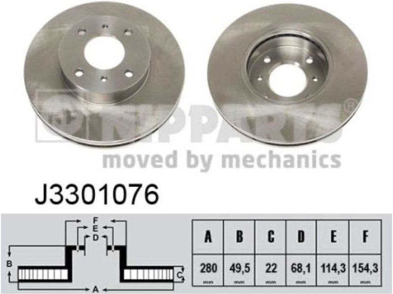 Criteries : Αριθμός οπών 4, Διάμετρος κέντρωσης [mm] 68,1, Διάμετρος κύκλου οπής [mm] 114,3, Διάμετρος πλήμνης τροχού [mm] 154,3, Ελάχιστο πάχος [mm] 20, Εξωτερική διάμετρος [mm] 280, Πάχος δισκόπλακας [mm] 22, Πλευρά τοποθέτησης μπροστινός άξονας, Τύπος δισκόφρενων εσωτερικά αεριζόμενο, Υψος [mm] 49,5