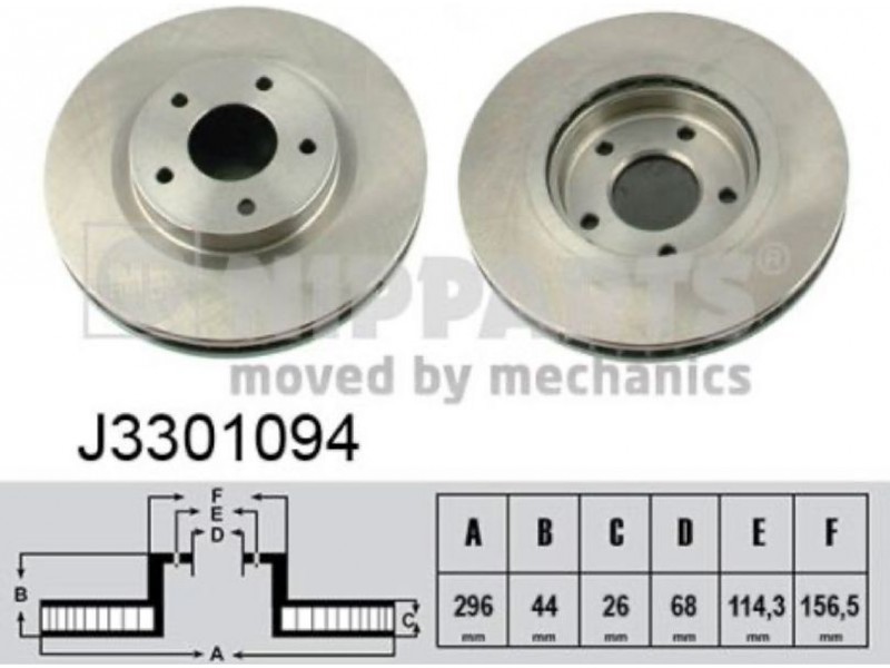Criteries : Αριθμός οπών 5, Διάμετρος κέντρωσης [mm] 68, Διάμετρος κύκλου οπής [mm] 114,3, Διάμετρος πλήμνης τροχού [mm] 156,5, Ελάχιστο πάχος [mm] 24, Εξωτερική διάμετρος [mm] 296, Πάχος δισκόπλακας [mm] 26, Τύπος δισκόφρενων εσωτερικά αεριζόμενο, Υψος [mm] 44