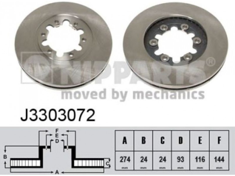 Criteries : Αριθμός οπών 6, Διάμετρος κέντρωσης [mm] 93, Διάμετρος κύκλου οπής [mm] 116, Διάμετρος πλήμνης τροχού [mm] 144, Ελάχιστο πάχος [mm] 22, Εξωτερική διάμετρος [mm] 274, Πάχος δισκόπλακας [mm] 24, Τύπος δισκόφρενων εσωτερικά αεριζόμενο, Υψος [mm] 24