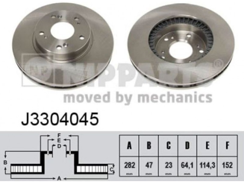 Criteries : Αριθμός οπών 5, Διάμετρος κέντρωσης [mm] 64,1, Διάμετρος κύκλου οπής [mm] 114,3, Διάμετρος πλήμνης τροχού [mm] 152, Ελάχιστο πάχος [mm] 21, Εξωτερική διάμετρος [mm] 282, Πάχος δισκόπλακας [mm] 23, Πλευρά τοποθέτησης μπροστινός άξονας, Τύπος δισκόφρενων εσωτερικά αεριζόμενο, Υψος [mm] 47