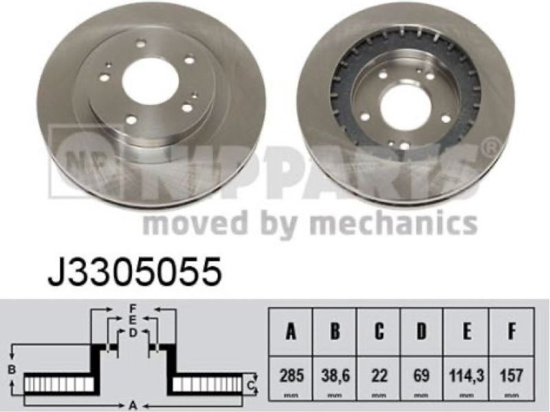 Criteries : Αριθμός οπών 5, Διάμετρος κέντρωσης [mm] 69, Διάμετρος κύκλου οπής [mm] 114,3, Διάμετρος πλήμνης τροχού [mm] 157, Ελάχιστο πάχος [mm] 20,4, Εξωτερική διάμετρος [mm] 285, Πάχος δισκόπλακας [mm] 22, Πλευρά τοποθέτησης μπροστινός άξονας, Τύπος δισκόφρενων εσωτερικά αεριζόμενο, Υψος [mm] 38,6
