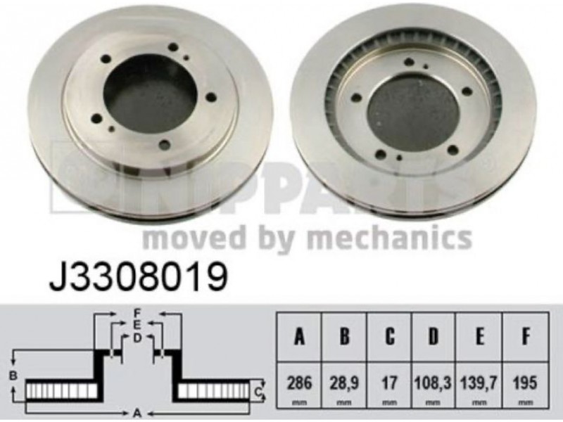 Criteries : Αριθμός οπών 5, Διάμετρος κέντρωσης [mm] 108,3, Διάμετρος κύκλου οπής [mm] 139,7, Διάμετρος πλήμνης τροχού [mm] 195, Ελάχιστο πάχος [mm] 15, Εξωτερική διάμετρος [mm] 286, Πάχος δισκόπλακας [mm] 17, Πλευρά τοποθέτησης μπροστινός άξονας, Τύπος δισκόφρενων εσωτερικά αεριζόμενο, Υψος [mm] 28,9