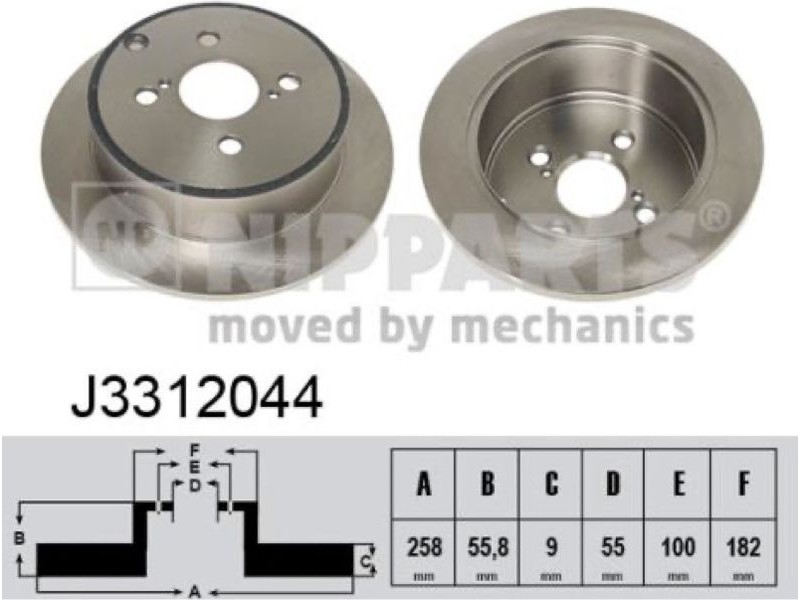 Criteries : Αριθμός οπών 4, Διάμετρος κέντρωσης [mm] 55, Διάμετρος κύκλου οπής [mm] 100, Διάμετρος πλήμνης τροχού [mm] 182, Ελάχιστο πάχος [mm] 8, Εξωτερική διάμετρος [mm] 258, Πάχος δισκόπλακας [mm] 9, Τύπος δισκόφρενων πλήρες, Υψος [mm] 55,8