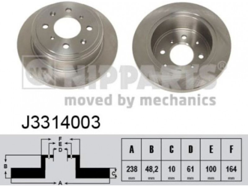 Criteries : Αριθμός οπών 4, Διάμετρος κέντρωσης [mm] 61, Διάμετρος κύκλου οπής [mm] 100, Διάμετρος πλήμνης τροχού [mm] 164, Ελάχιστο πάχος [mm] 8, Εξωτερική διάμετρος [mm] 238, Πάχος δισκόπλακας [mm] 10, Πλευρά τοποθέτησης Πίσω άξονας, Τύπος δισκόφρενων πλήρες, Υψος [mm] 48,2