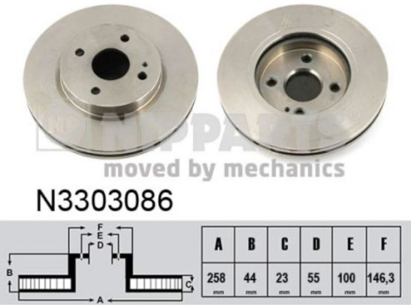 Criteries : Αριθμός οπών 4, Διάμετρος κέντρωσης [mm] 55, Διάμετρος κύκλου οπής [mm] 100, Διάμετρος πλήμνης τροχού [mm] 146,3, Ελάχιστο πάχος [mm] 21, Εξωτερική διάμετρος [mm] 258, Πάχος δισκόπλακας [mm] 23, Πλευρά τοποθέτησης μπροστινός άξονας, Τύπος δισκόφρενων εσωτερικά αεριζόμενο, Υψος [mm] 44