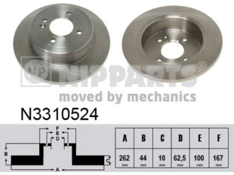 Criteries : Αριθμός οπών 4, Διάμετρος κέντρωσης [mm] 62,5, Διάμετρος κύκλου οπής [mm] 100, Διάμετρος πλήμνης τροχού [mm] 167, Ελάχιστο πάχος [mm] 8,4, Εξωτερική διάμετρος [mm] 262, Πάχος δισκόπλακας [mm] 10, Πλευρά τοποθέτησης Πίσω άξονας, Τύπος δισκόφρενων πλήρες, Υψος [mm] 44