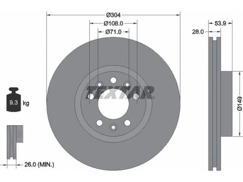 Criteries : Βάρος [kg] 9,3, Διάμετρος κέντρωσης [mm] 71, Διάμετρος κύκλου οπής [mm] 108, Διάμετρος οπής μπουλονιού τροχού [mm] 13,2, Ελάχιστο πάχος [mm] 26, Εξωτερική διάμετρος [mm] 304, Επιφάνεια με επίστρωση, Εσωτερική διάμετρος [mm] 137, μήκος συσκευασίας [cm] 31,3, Πατρόν τρύπας/αριθμός τρυπών 05/08, Πάχος δισκόπλακας [mm] 28, πλάτος συσκευασίας [cm] 31,3, Συμπληρωματικό προϊόν/ πληροφορίες 2 χωρίς μπουλόνια στερέωσης τροχού, Συμπληρωματικό προϊόν/ πληροφορίες 2 χωρίς πλήμνη, Συμπληρωματικό προϊόν/ πληροφορίες 2 χωρίς ρουλεμάν τροχού, Τύπος δισκόφρενων εσωτερικά αεριζόμενο, Υψος [mm] 53,9, ύψος συσκευασίας [cm] 14