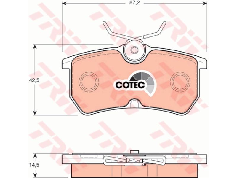 Criteries : Επαφή προειδοποίησης φθοράς όχι προετοιμασμένο για προειδοποιητική ένδειξη φθοράς, Πάχος [mm] 14,5, Περιορισμός κατασκευαστή TRW, Πλάτος [mm] 87,2, Στοιχεία ελέγχου E2 90R 01125/006, Συμπληρωματικό προϊόν / συμπληρωματική πληροφορία με αξεσουάρ, Συμπληρωματικό προϊόν/ πληροφορίες 2 με βίδες δαγκάνας φρένων, Υψος [mm] 42,5