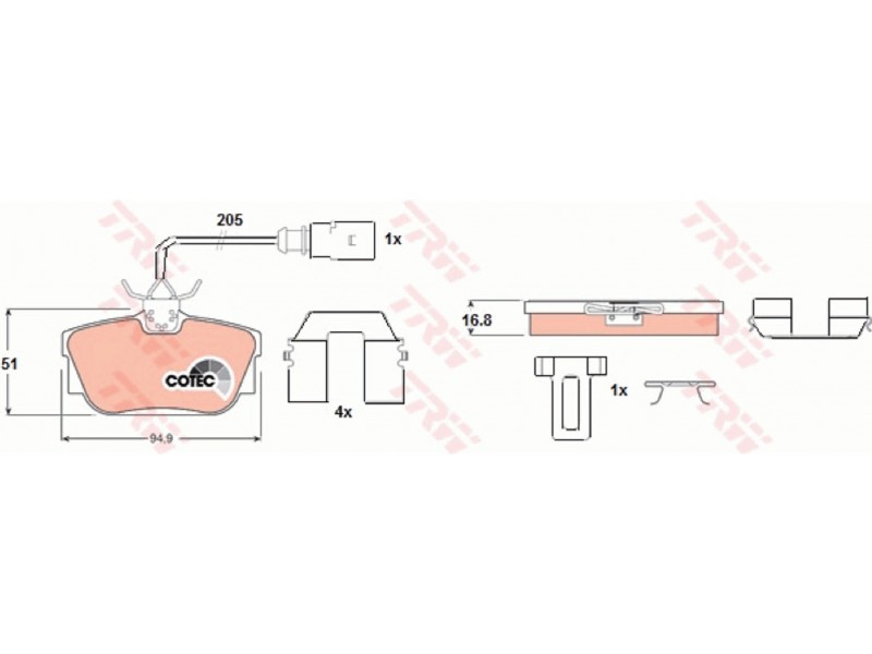 Criteries : Επαφή προειδοποίησης φθοράς συμπεριλ. επαφής για ένδειξη φθοράς, Μήκος επαφής προειδοποίησης [mm] 205, Πάχος [mm] 16,8, Περιορισμός κατασκευαστή TRW, Πλάτος [mm] 94,9, Πλήθος ενδείξεων φθοράς [ανά άξονα] 1, Στοιχεία ελέγχου E1 90R 01025/497, Συμπληρωματικό προϊόν / συμπληρωματική πληροφορία με αξεσουάρ, Συμπληρωματικό προϊόν/ πληροφορίες 2 με βίδες δαγκάνας φρένων, Υψος [mm] 51