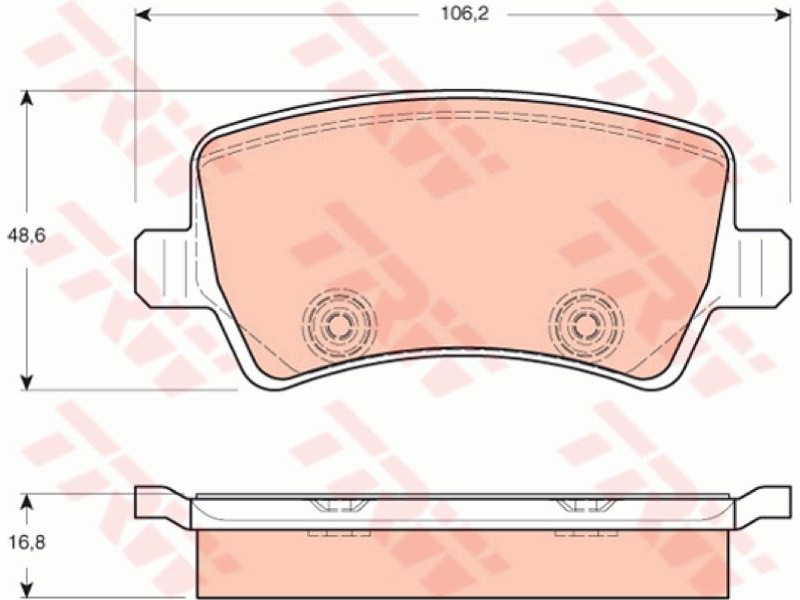 Criteries : Δώστε προσοχή στα τεχνικά στοιχεία , Επαφή προειδοποίησης φθοράς όχι προετοιμασμένο για προειδοποιητική ένδειξη φθοράς, Πάχος [mm] 16,8, Περιορισμός κατασκευαστή TRW, Πλάτος [mm] 106,2, Στοιχεία ελέγχου E9 90R - 01120/2048, Συμπληρωματικό προϊόν / συμπληρωματική πληροφορία με αξεσουάρ, Συμπληρωματικό προϊόν/ πληροφορίες 2 με βίδες δαγκάνας φρένων, Υψος [mm] 48,6