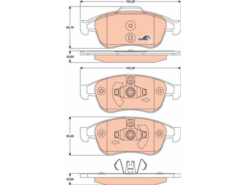 Criteries : Δώστε προσοχή στα τεχνικά στοιχεία , εξαρτώμενο από τη φορά περιστροφής , Επαφή προειδοποίησης φθοράς όχι προετοιμασμένο για προειδοποιητική ένδειξη φθοράς, Κωδικός του συνιστώμενου εξαρτήματος PFK302, Πάχος [mm] 18, Περιορισμός κατασκευαστή ATE, Πλάτος [mm] 155,2, Στοιχεία ελέγχου E9 90R - 01107/1676, Ύψος 1 [mm] 64,7, Ύψος 2 [mm] 59,4