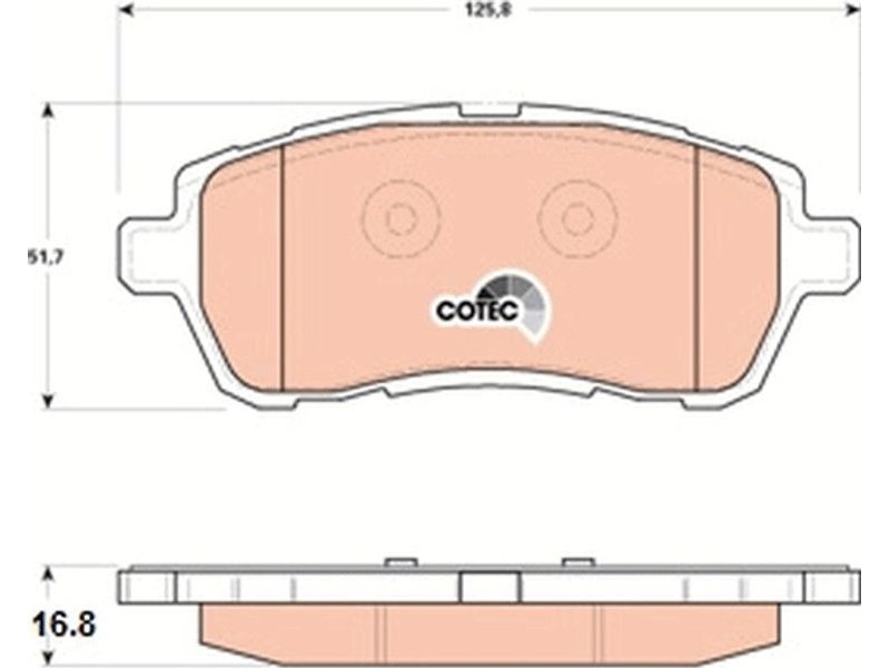 Criteries : Επαφή προειδοποίησης φθοράς όχι προετοιμασμένο για προειδοποιητική ένδειξη φθοράς, Πάχος [mm] 16,8, Περιορισμός κατασκευαστή TRW, Πλάτος [mm] 125,8, Στοιχεία ελέγχου E9 90R - 01107/2542, Συμπληρωματικό προϊόν / συμπληρωματική πληροφορία με αξεσουάρ, Συμπληρωματικό προϊόν/ πληροφορίες 2 με βίδες δαγκάνας φρένων, Υψος [mm] 51,7