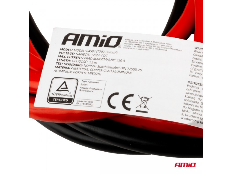 Amio - Καλώδια Φόρτισης Μπαταρίας (Ρευματοδότες) τάση λειτουργίας 12-24V ένταση ρεύματος 350A μήκος 3,5m με πιστοποίηση TUV για Επιβατικά Αυτοκίνητα και Φορτηγά - 1 σετ (04594/AM)
