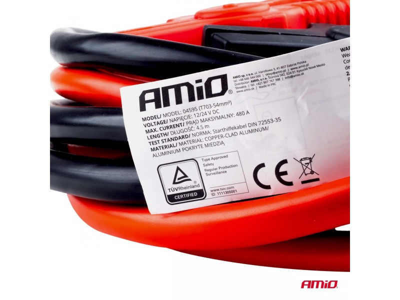 Amio - Καλώδια Φόρτισης Μπαταρίας (Ρευματοδότες) τάση λειτουργίας 12-24V ένταση ρεύματος 480A μήκος 4,5m με πιστοποίηση TUV για Επιβατικά Αυτοκίνητα και Φορτηγά - 1 σετ (04595/AM)