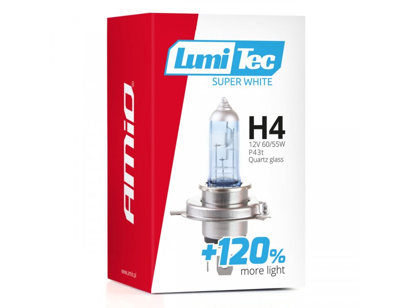 Amio - Λάμπα H4 Βάση P43t Τάση Λειτουργίας 12V Απόδοσης 60/55W Τύπου Lumitec Superwhite +120% Για Επιβατικά Αυτοκίνητα - 1 τεμ. (02137/AM)