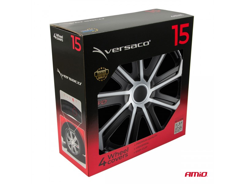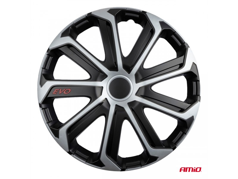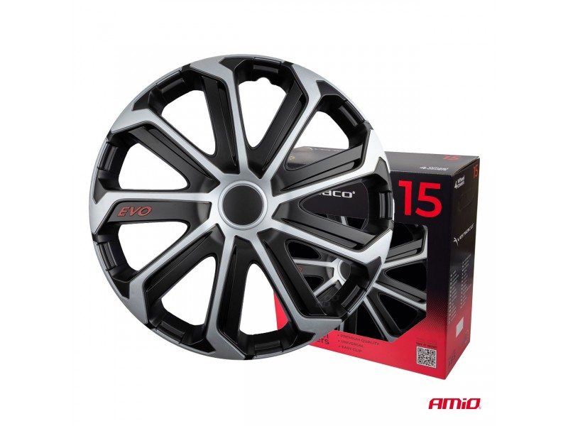 Amio - Σετ Τάσια Τροχών 15'' ιντσών, Μοντέλο EVO, Χρώμα Μαύρο / Ασημί – Σετ 4 Τεμαχίων Σε Κουτί (9757/AM)
