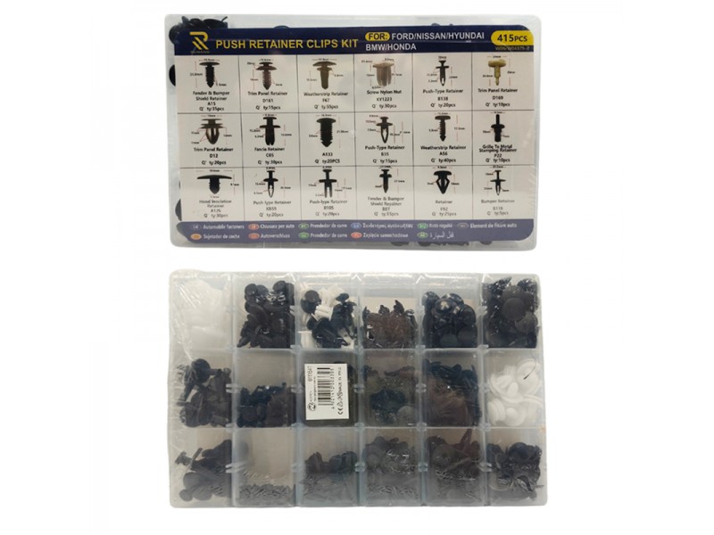 Σετ 415 κουμπώματα ταπετσαρίας αυτοκινήτου, συμβατά με Ford, Nissan, Hyundai, BMW και Honda. Περιλαμβάνει 18 διαφορετικά σχέδια ώστε να καλύπτονται πόρτες, ταμπλό, επενδύσεις οροφής και άλλα σημεία. Κατασκευασμένα από ανθεκτικό πλαστικό υψηλής ποιότητας, με ασφαλή εφαρμογή και αντοχή σε κραδασμούς.