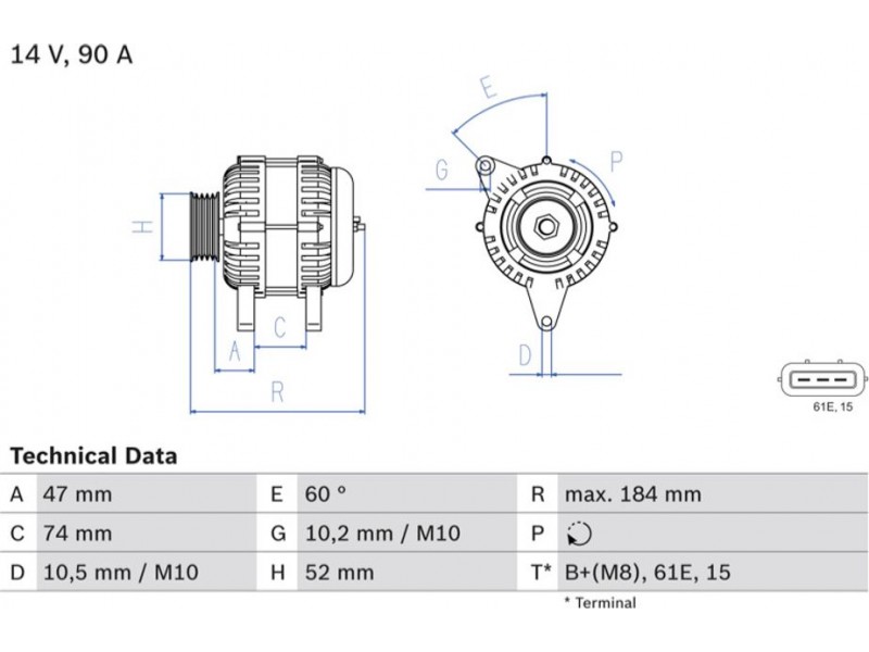 Criteries : ID παραλλαγής σύνδεσης PL52, Απόσταση από την τροχαλία ιμάντα προς τη γεννήτρια [mm] 47, Διάμ. τροχαλίας ιμάντα [mm] 52, Επαφή B+(M8),61E,15, Μήκος [mm] 184, Παλαιό εξάρτημα , Παραλλαγή γεννήτριας εξαιρουμ. αντλίας υποπίεσης, Πλήθος εγκοπών 6, προτεινόμενη επέκταση επισκευής Ιμάντας/ιμάντας poly-V, Ρεύμα φόρτισης γεννήτριας [A] 90, Τάση [V] 14, Τρόπος στερέωσης Διπλός μοχλός κέντρου περιστροφ, Τροχαλίες ιμάντων με πολλαπλή τροχαλία ιμάντα, Φορά περιστροφής Φορά περιστροφής προς τα δεξιά