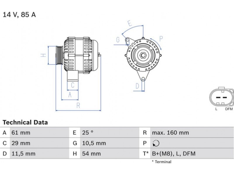 Criteries : ID παραλλαγής σύνδεσης PL61, Απόσταση από την τροχαλία ιμάντα προς τη γεννήτρια [mm] 61,2, Διάμ. τροχαλίας ιμάντα [mm] 54, Επαφή B2+(M8), Επαφή DFM, Επαφή L, Μήκος [mm] 160, Παλαιό εξάρτημα , Παραλλαγή γεννήτριας εξαιρουμ. αντλίας υποπίεσης, Πλήθος εγκοπών 5, προτεινόμενη επέκταση επισκευής Ιμάντας/ιμάντας poly-V, Ρεύμα φόρτισης γεννήτριας [A] 85, Τάση [V] 14, Τρόπος στερέωσης Μονός μοχλός κέντρου περιστροφή, Τροχαλίες ιμάντων με πολλαπλή τροχαλία ιμάντα, Φορά περιστροφής Φορά περιστροφής προς τα δεξιά