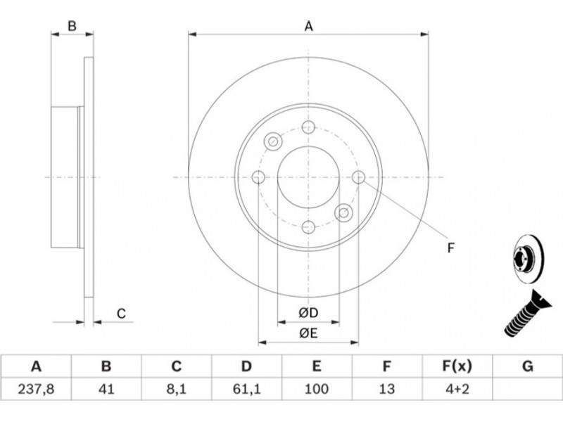 Criteries : Αριθμός οπών 4, Διάμετρος κέντρωσης [mm] 61,1, Διάμετρος κύκλου οπής [mm] 100, Διάμετρος οπής έως [mm] 13, Ελάχιστο πάχος [mm] 7, Εξωτερική διάμετρος [mm] 237,8, Επιφάνεια λαδωμένο, Πάχος δισκόπλακας [mm] 8,1, Συμπληρωματικό προϊόν/ πληροφορίες 2 Με βίδες, Τύπος δισκόφρενων πλήρες, Υψος [mm] 41