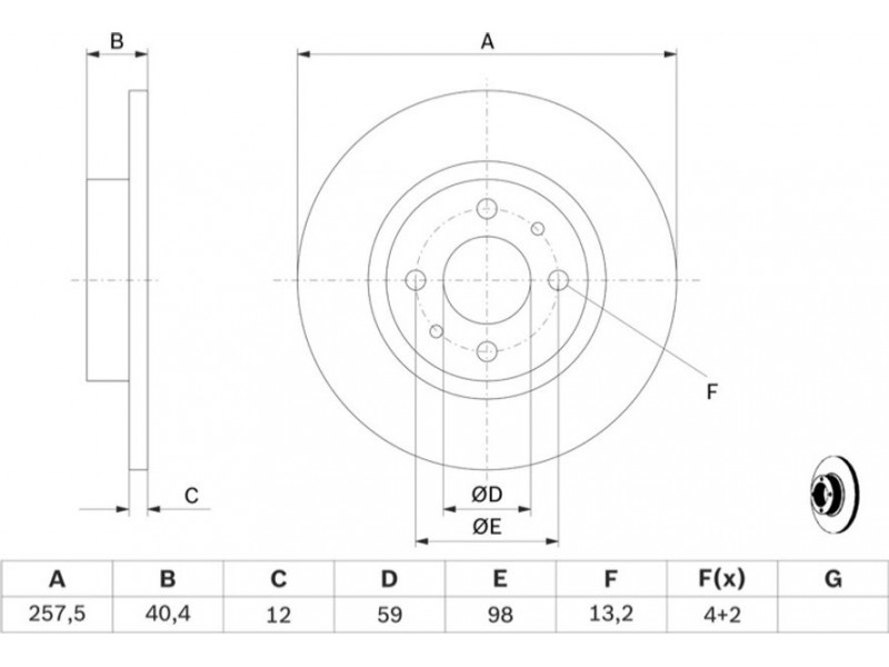 Criteries : Αριθμός οπών 4, Διάμετρος κέντρωσης [mm] 59, Διάμετρος κύκλου οπής [mm] 98, Διάμετρος οπής έως [mm] 13,1, Ελάχιστο πάχος [mm] 10,2, Εξωτερική διάμετρος [mm] 257,5, Επιφάνεια λαδωμένο, Πάχος δισκόπλακας [mm] 12, πληρεί τις προδιαγραφές ECE ECE-R90, Τύπος δισκόφρενων πλήρες, Υψος [mm] 40,5