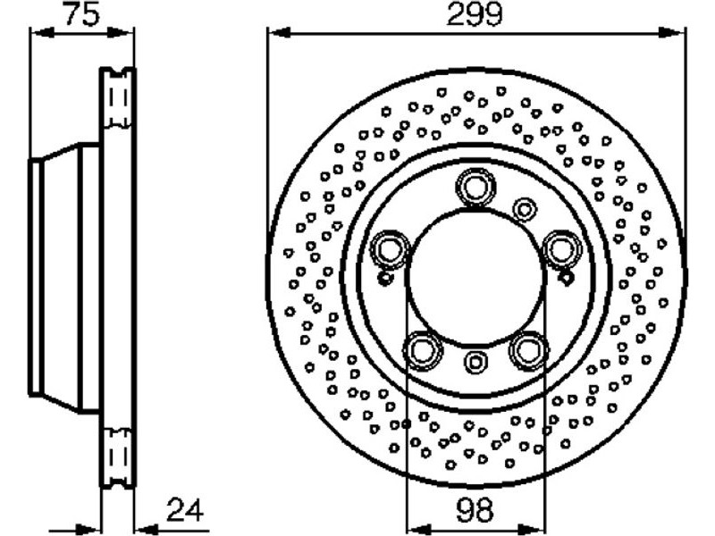 Criteries : Αριθμός οπών 5, Διάμετρος κέντρωσης [mm] 98, Διάμετρος κύκλου οπής [mm] 130, Διάμετρος οπής έως [mm] 15,4, Ελάχιστο πάχος [mm] 22, Εξωτερική διάμετρος [mm] 299, Επιφάνεια με επίστρωση, Πάχος δισκόπλακας [mm] 24, πληρεί τις προδιαγραφές ECE ECE-R90, Τύπος δισκόφρενων αεριζόμενο, Τύπος δισκόφρενων τρυπητό, Υψος [mm] 75