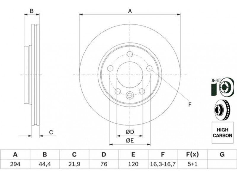 Criteries : Αριθμός οπών 5, Διάμετρος κέντρωσης [mm] 76, Διάμετρος κύκλου οπής [mm] 120, Διάμετρος οπής έως [mm] 16,6, Ελάχιστο πάχος [mm] 19,5, Εξωτερική διάμετρος [mm] 294, Επεξεργασία υψηλής ανθράκωσης, Επιφάνεια με επίστρωση, Πάχος δισκόπλακας [mm] 22, πληρεί τις προδιαγραφές ECE ECE-R90, Τύπος δισκόφρενων αεριζόμενο, Υψος [mm] 44,2