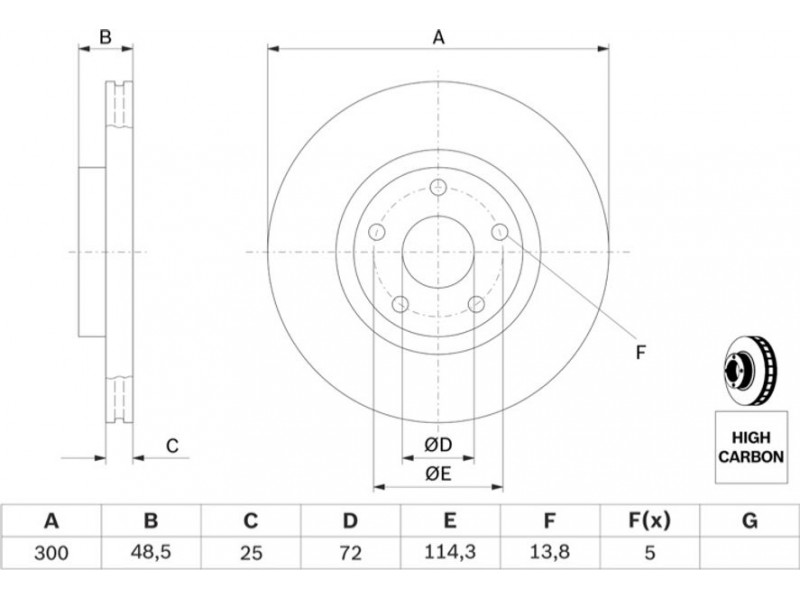 Criteries : Αριθμός οπών 5, Διάμετρος κέντρωσης [mm] 72, Διάμετρος κύκλου οπής [mm] 114,3, Διάμετρος οπής έως [mm] 13,8, Ελάχιστο πάχος [mm] 23, Εξωτερική διάμετρος [mm] 300, Επεξεργασία υψηλής ανθράκωσης, Επιφάνεια λαδωμένο, Πάχος δισκόπλακας [mm] 25, πληρεί τις προδιαγραφές ECE ECE-R90, Τύπος δισκόφρενων αεριζόμενο, Υψος [mm] 48,5
