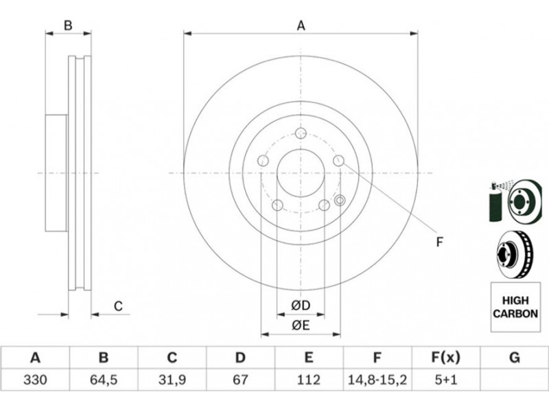 Criteries : Αριθμός οπών 5, Διάμετρος κέντρωσης [mm] 67, Διάμετρος κύκλου οπής [mm] 112, Διάμετρος οπής έως [mm] 15,3, Ελάχιστο πάχος [mm] 29,4, Εξωτερική διάμετρος [mm] 330, Επεξεργασία υψηλής ανθράκωσης, Επιφάνεια με επίστρωση, Πάχος δισκόπλακας [mm] 32, πληρεί τις προδιαγραφές ECE ECE-R90, Τύπος δισκόφρενων αεριζόμενο, Υψος [mm] 64,5