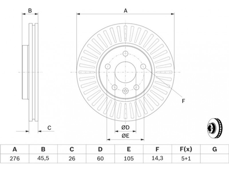 Criteries : Αριθμός οπών 5, Διάμετρος κέντρωσης [mm] 60, Διάμετρος κύκλου οπής [mm] 105, Διάμετρος οπής έως [mm] 14,3, Ελάχιστο πάχος [mm] 23, Εξωτερική διάμετρος [mm] 276, Επιφάνεια λαδωμένο, Πάχος δισκόπλακας [mm] 26, πληρεί τις προδιαγραφές ECE ECE-R90, Συμπληρωματικό προϊόν/ πληροφορίες 2 Με βίδες, Τύπος δισκόφρενων αεριζόμενο, Υψος [mm] 45,5