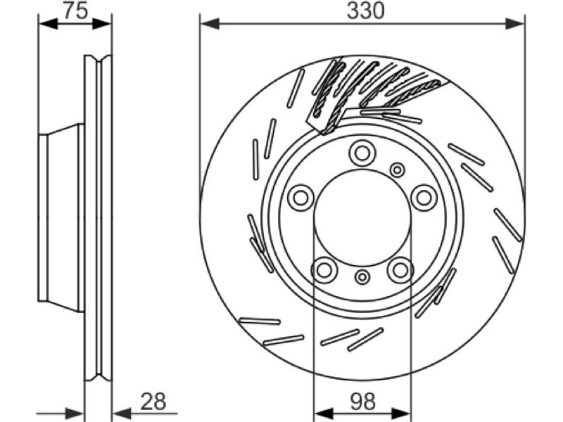 Criteries : Αριθμός οπών 5, Διάμετρος κέντρωσης [mm] 98, Διάμετρος κύκλου οπής [mm] 130, Διάμετρος οπής έως [mm] 15,4, Ελάχιστο πάχος [mm] 26, Εξωτερική διάμετρος [mm] 330, Επεξεργασία υψηλής ανθράκωσης, Επιφάνεια με επίστρωση, κωδικός προϊόντος κατά ζεύγος 0 986 479 732, Πάχος δισκόπλακας [mm] 28, πληρεί τις προδιαγραφές ECE ECE-R90, Τύπος δισκόφρενων αεριζόμενο, Τύπος δισκόφρενων με εγκοπές, Υψος [mm] 75,1