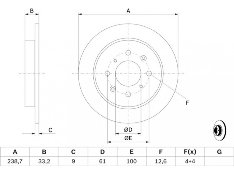 Criteries : Αριθμός οπών 4, Διάμετρος κέντρωσης [mm] 61, Διάμετρος κύκλου οπής [mm] 100, Διάμετρος οπής έως [mm] 12,6, Ελάχιστο πάχος [mm] 8, Εξωτερική διάμετρος [mm] 238,7, Επιφάνεια λαδωμένο, Πάχος δισκόπλακας [mm] 9, πληρεί τις προδιαγραφές ECE ECE-R90, Τύπος δισκόφρενων πλήρες, Υψος [mm] 33,2