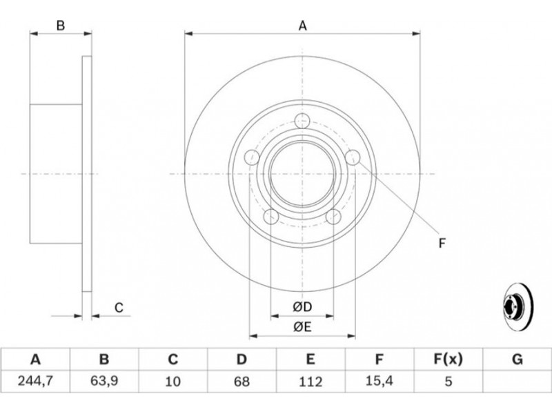 Criteries : Αριθμός οπών 5, Διάμετρος κέντρωσης [mm] 68,1, Διάμετρος κύκλου οπής [mm] 112, Διάμετρος οπής έως [mm] 15,4, Ελάχιστο πάχος [mm] 8, Εξωτερική διάμετρος [mm] 244,9, Επιφάνεια με επίστρωση, Πάχος δισκόπλακας [mm] 10, πληρεί τις προδιαγραφές ECE ECE-R90, Τύπος δισκόφρενων πλήρες, Υψος [mm] 63,9