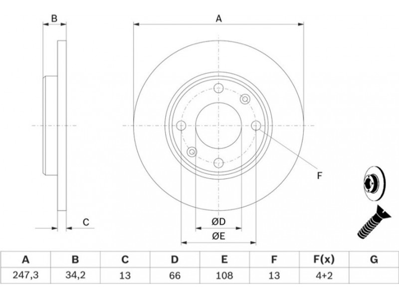 Criteries : Αριθμός οπών 4, Διάμετρος κέντρωσης [mm] 66, Διάμετρος κύκλου οπής [mm] 108, Διάμετρος οπής έως [mm] 13, Ελάχιστο πάχος [mm] 11, Εξωτερική διάμετρος [mm] 247, Επιφάνεια με επίστρωση, Πάχος δισκόπλακας [mm] 13, πληρεί τις προδιαγραφές ECE ECE-R90, Συμπληρωματικό προϊόν/ πληροφορίες 2 Με βίδες, Τύπος δισκόφρενων πλήρες, Υψος [mm] 34,3