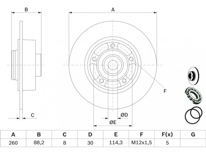 Criteries : Αριθμός οπών 5, Διάμετρος κέντρωσης [mm] 61,98, Διάμετρος κύκλου οπής [mm] 114,3, Ελάχιστο πάχος [mm] 7, Εξωτερική διάμετρος [mm] 260, Επιφάνεια με επίστρωση, Εσωτερική διάμετρος [mm] 30, Πάχος δισκόπλακας [mm] 8, πληρεί τις προδιαγραφές ECE ECE-R90, Συμπληρωματικό προϊόν/ πληροφορίες 2 με δακτύλιο αισθητήρα του ABS, Συμπληρωματικό προϊόν/ πληροφορίες 2 με ρουλεμάν τροχού, Τύπος δισκόφρενων πλήρες, Υψος [mm] 88,2
