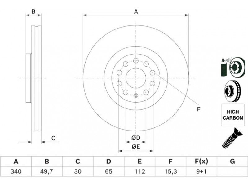 Criteries : Αριθμός οπών 5, Διάμετρος κέντρωσης [mm] 65, Διάμετρος κύκλου οπής [mm] 112, Διάμετρος οπής έως [mm] 15,3, Ελάχιστο πάχος [mm] 27, Εξωτερική διάμετρος [mm] 340, Επεξεργασία υψηλής ανθράκωσης, Επιφάνεια με επίστρωση, Πάχος δισκόπλακας [mm] 30, πληρεί τις προδιαγραφές ECE ECE-R90, Συμπληρωματικό προϊόν/ πληροφορίες 2 Με βίδες, Τύπος δισκόφρενων αεριζόμενο, Υψος [mm] 49,7