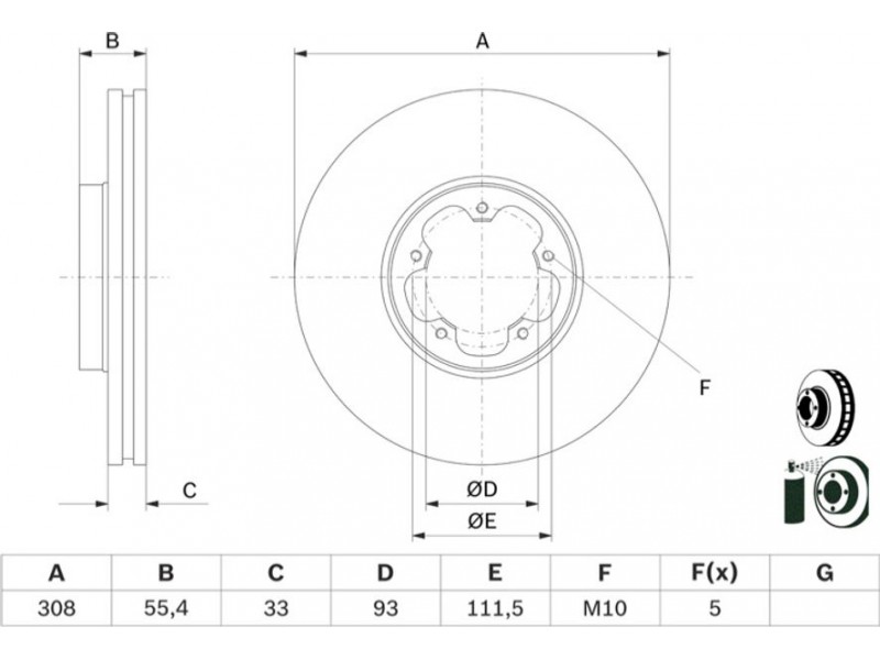 Criteries : Αριθμός οπών 5, Διάμετρος κέντρωσης [mm] 93, Διάμετρος κύκλου οπής [mm] 111,5, Ελάχιστο πάχος [mm] 30, Εξωτερική διάμετρος [mm] 308, Επιφάνεια με επίστρωση, Πάχος δισκόπλακας [mm] 33, πληρεί τις προδιαγραφές ECE ECE-R90, Τύπος δισκόφρενων αεριζόμενο, Υψος [mm] 55,4