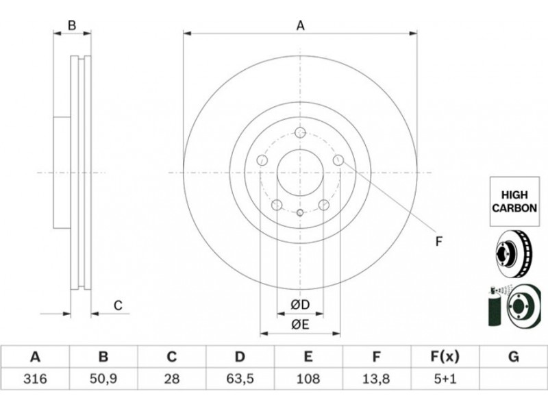 Criteries : Αριθμός οπών 5, Διάμετρος κέντρωσης [mm] 63,5, Διάμετρος κύκλου οπής [mm] 108, Διάμετρος οπής έως [mm] 13,8, Ελάχιστο πάχος [mm] 26,5, Εξωτερική διάμετρος [mm] 316, Επεξεργασία υψηλής ανθράκωσης, Επιφάνεια με επίστρωση, Πάχος δισκόπλακας [mm] 28, πληρεί τις προδιαγραφές ECE ECE-R90, Τύπος δισκόφρενων αεριζόμενο, Υψος [mm] 50,9