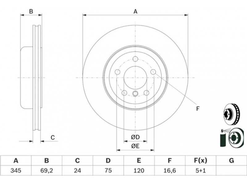 Criteries : Αριθμός οπών 5, Διάμετρος κέντρωσης [mm] 75, Διάμετρος κύκλου οπής [mm] 120, Διάμετρος οπής έως [mm] 16,6, Ελάχιστο πάχος [mm] 22,4, Εξωτερική διάμετρος [mm] 345, Επιφάνεια με επίστρωση, Πάχος δισκόπλακας [mm] 24, Τύπος δισκόφρενων αεριζόμενο, Υψος [mm] 69,2