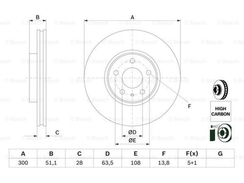Criteries : Αριθμός οπών 5, Διάμετρος κέντρωσης [mm] 63,5, Διάμετρος κύκλου οπής [mm] 108, Διάμετρος οπής έως [mm] 13,8, Ελάχιστο πάχος [mm] 26,5, Εξωτερική διάμετρος [mm] 300, Επεξεργασία υψηλής ανθράκωσης, Επιφάνεια με επίστρωση, Πάχος δισκόπλακας [mm] 28, Τύπος δισκόφρενων αεριζόμενο, Υψος [mm] 51,1