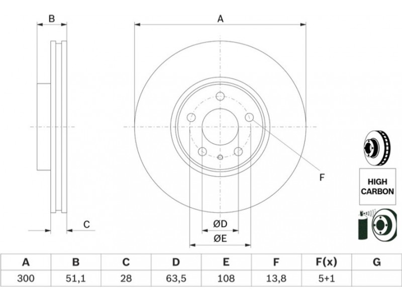 Criteries : Αριθμός οπών 5, Διάμετρος κέντρωσης [mm] 63,5, Διάμετρος κύκλου οπής [mm] 108, Διάμετρος οπής έως [mm] 13,8, Ελάχιστο πάχος [mm] 26,5, Εξωτερική διάμετρος [mm] 300, Επεξεργασία υψηλής ανθράκωσης, Επιφάνεια με επίστρωση, Πάχος δισκόπλακας [mm] 28, πληρεί τις προδιαγραφές ECE ECE-R90, Τύπος δισκόφρενων αεριζόμενο, Υψος [mm] 51,2