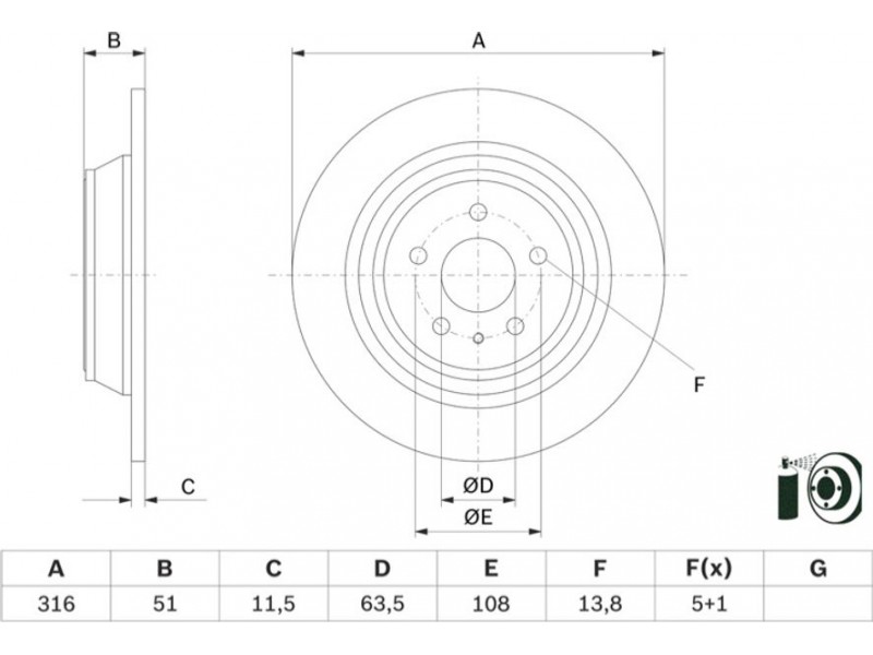 Criteries : Αριθμός οπών 5, Διάμετρος κέντρωσης [mm] 63,5, Διάμετρος κύκλου οπής [mm] 108, Διάμετρος οπής έως [mm] 13,8, Ελάχιστο πάχος [mm] 9,5, Εξωτερική διάμετρος [mm] 316, Επιφάνεια με επίστρωση, Πάχος δισκόπλακας [mm] 11,5, πληρεί τις προδιαγραφές ECE ECE-R90, Τύπος δισκόφρενων πλήρες, Υψος [mm] 51