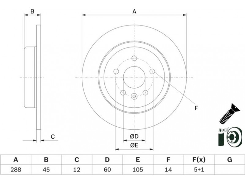 Criteries : Αριθμός οπών 5, Διάμετρος κέντρωσης [mm] 60, Διάμετρος κύκλου οπής [mm] 105, Διάμετρος οπής έως [mm] 14, Ελάχιστο πάχος [mm] 10, Εξωτερική διάμετρος [mm] 288, Επιφάνεια με επίστρωση, Πάχος δισκόπλακας [mm] 12, πληρεί τις προδιαγραφές ECE ECE-R90, Συμπληρωματικό προϊόν/ πληροφορίες 2 Με βίδες, Τύπος δισκόφρενων πλήρες, Υψος [mm] 45