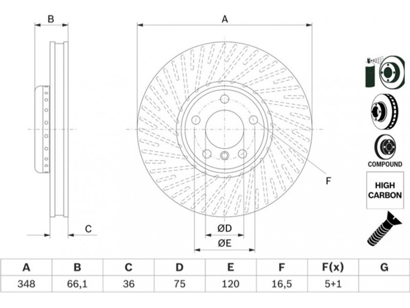 Criteries : Διάμετρος κέντρωσης [mm] 75, Διάμετρος κύκλου οπής [mm] 120, Διάμετρος οπής έως [mm] 16,5, Δώστε προσοχή στις πληροφορίες για το σέρβις , Ελάχιστο πάχος [mm] 34,4, Εξωτερική διάμετρος [mm] 348, Επεξεργασία υψηλής ανθράκωσης, Επιφάνεια με επίστρωση, κωδικός προϊόντος κατά ζεύγος 0986479E18, Πάχος δισκόπλακας [mm] 36, πληρεί τις προδιαγραφές ECE ECE-R90, Συμπληρωματικό προϊόν/ πληροφορίες 2 Με βίδες, Τύπος δισκόφρενων αεριζόμενο, Τύπος δισκόφρενων δισκόπλακα δύο τμημάτων, Υψος [mm] 66,1
