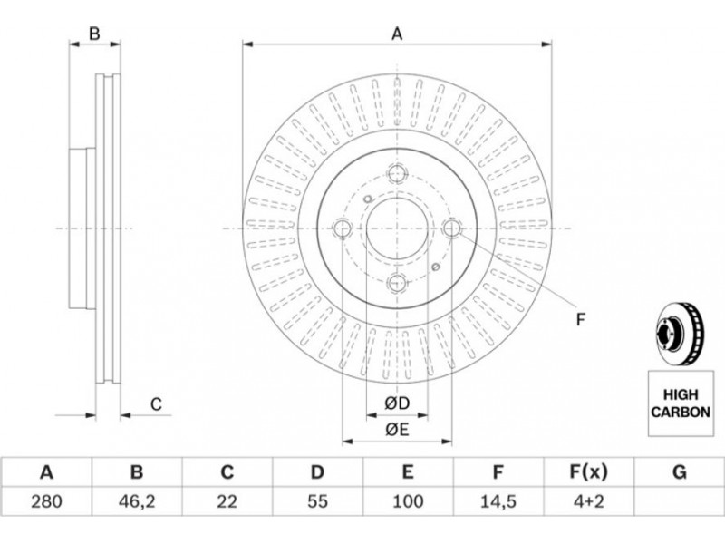Criteries : Αριθμός οπών 4, Διάμετρος κέντρωσης [mm] 55, Διάμετρος κύκλου οπής [mm] 100, Διάμετρος οπής έως [mm] 14,5, Ελάχιστο πάχος [mm] 20, Εξωτερική διάμετρος [mm] 280, Επεξεργασία υψηλής ανθράκωσης, Επιφάνεια λαδωμένο, Πάχος δισκόπλακας [mm] 22, πληρεί τις προδιαγραφές ECE ECE-R90, Τύπος δισκόφρενων αεριζόμενο, Υψος [mm] 46,2