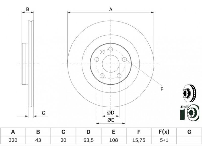 Criteries : Αριθμός οπών 5, Διάμετρος κέντρωσης [mm] 63,5, Διάμετρος κύκλου οπής [mm] 108, Διάμετρος οπής έως [mm] 15,75, Ελάχιστο πάχος [mm] 17,5, Εξωτερική διάμετρος [mm] 320, Επιφάνεια με επίστρωση, Πάχος δισκόπλακας [mm] 20, πληρεί τις προδιαγραφές ECE ECE-R90, Τύπος δισκόφρενων αεριζόμενο, Υψος [mm] 43